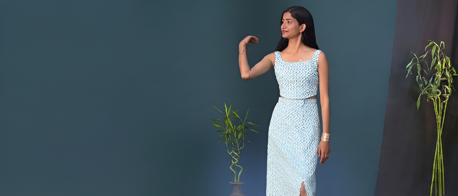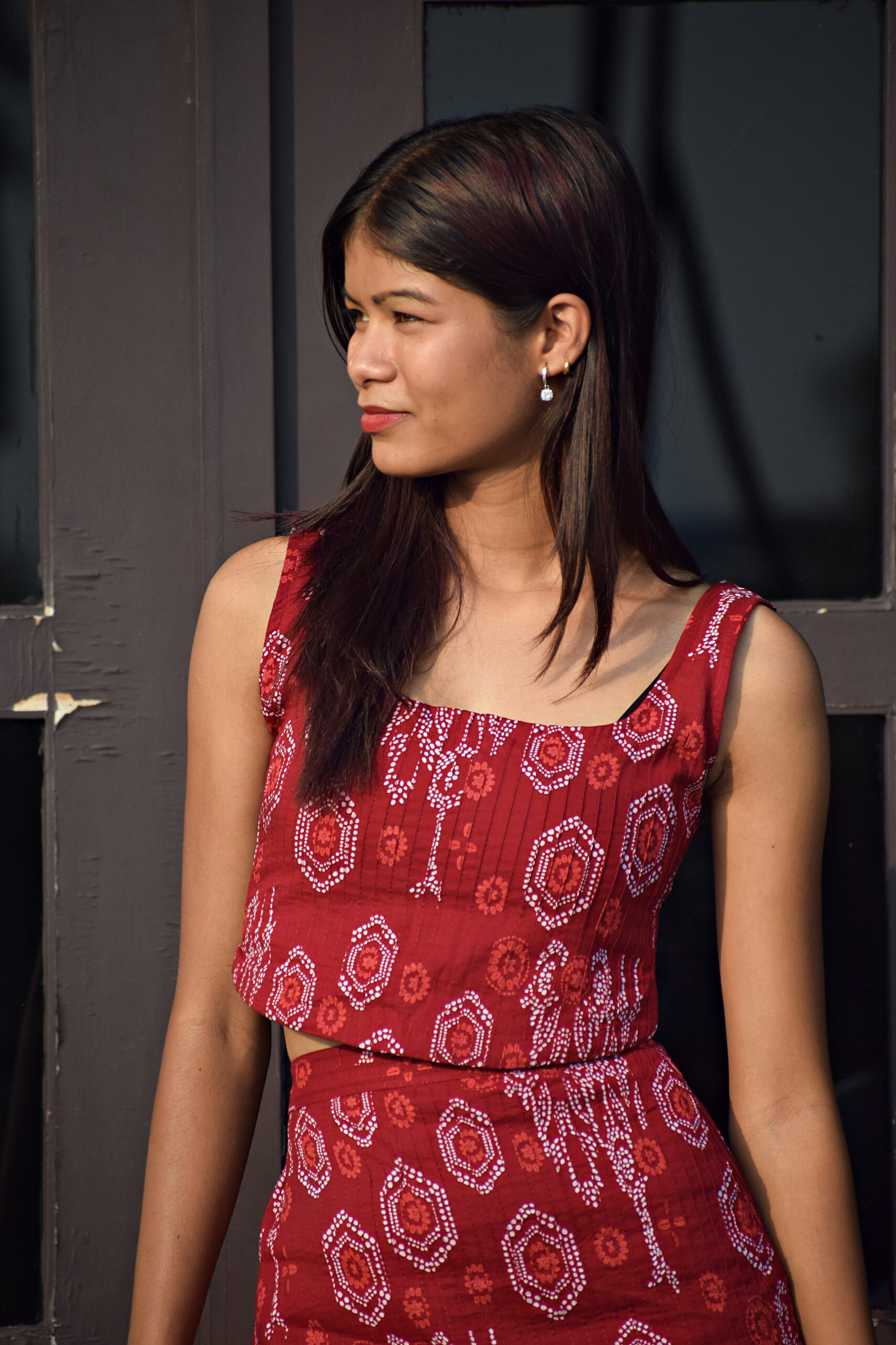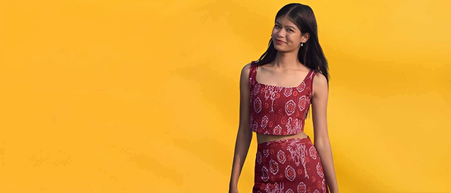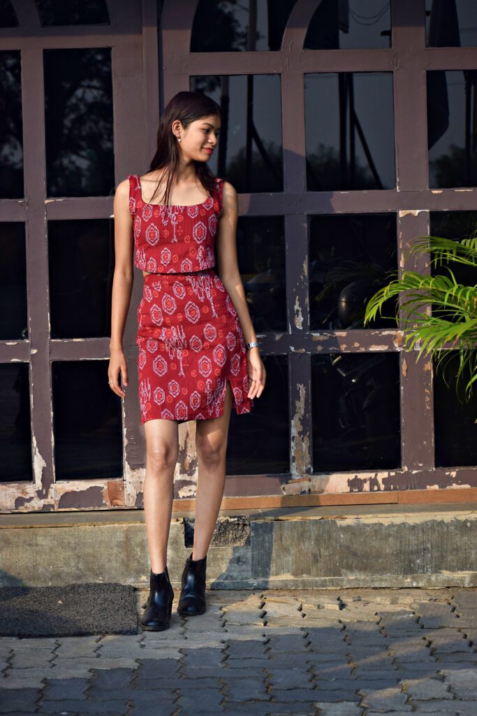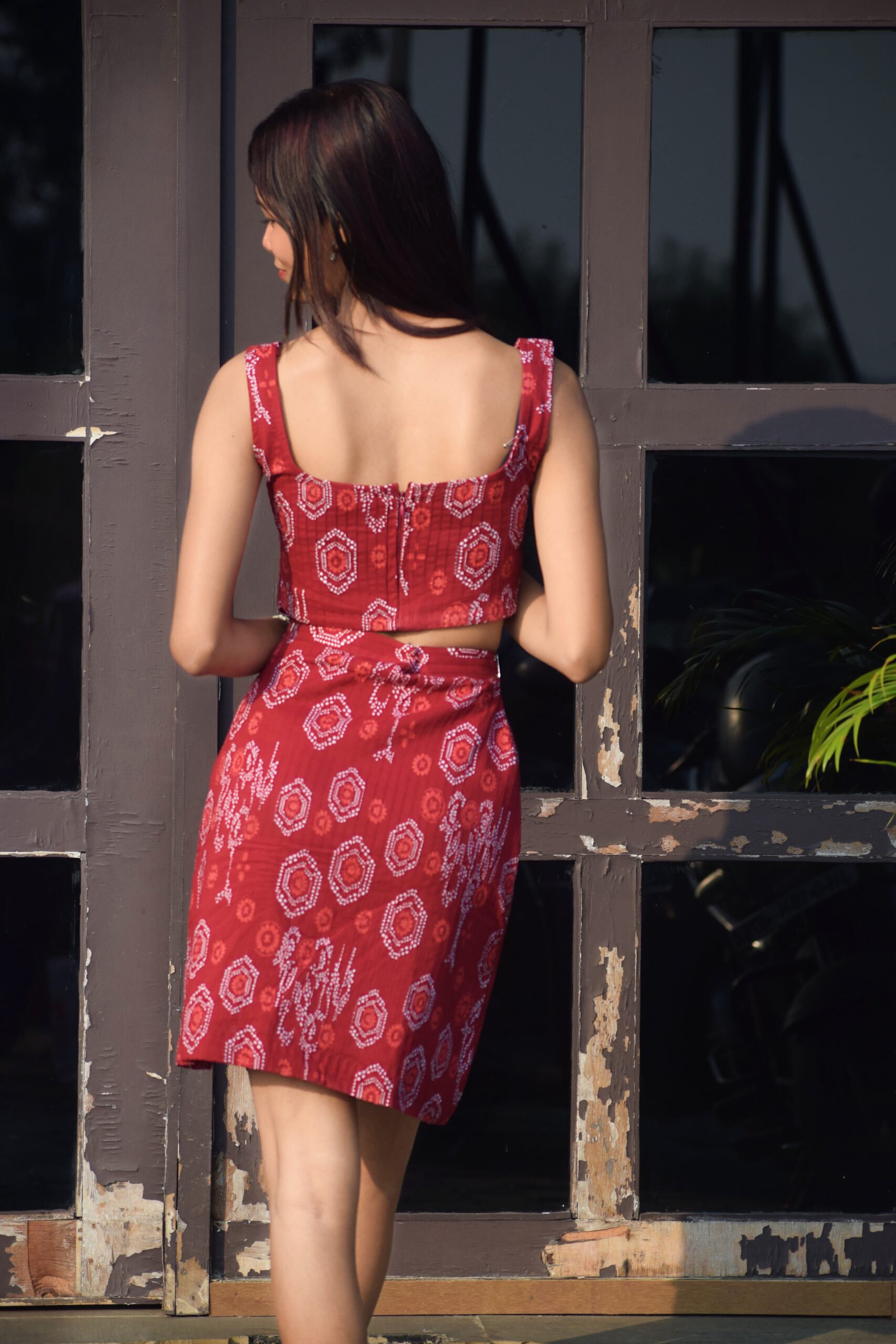 A chic crimson co-ord set with Bandhani-inspired prints, featuring a sleeveless crop top and a high-waist skirt for a bold yet elegant look.