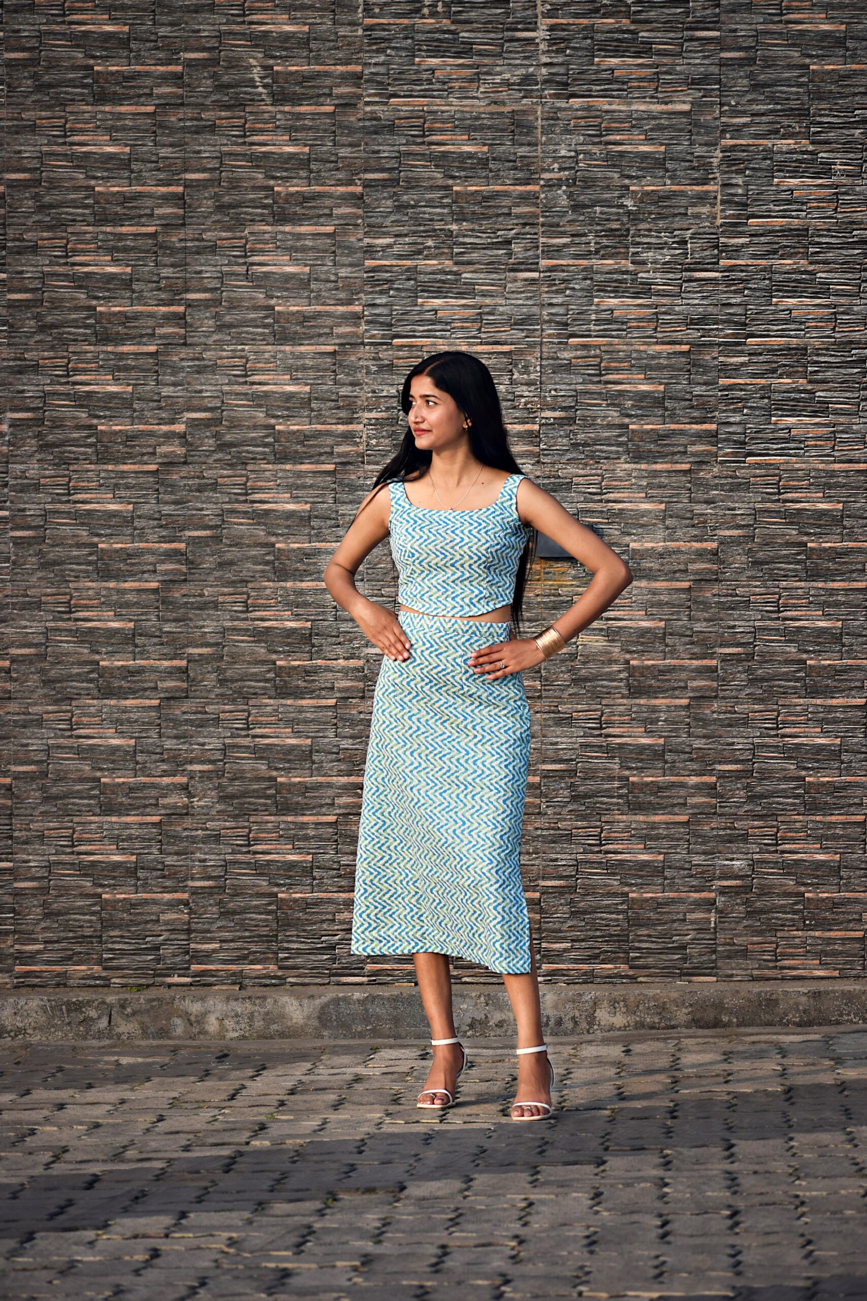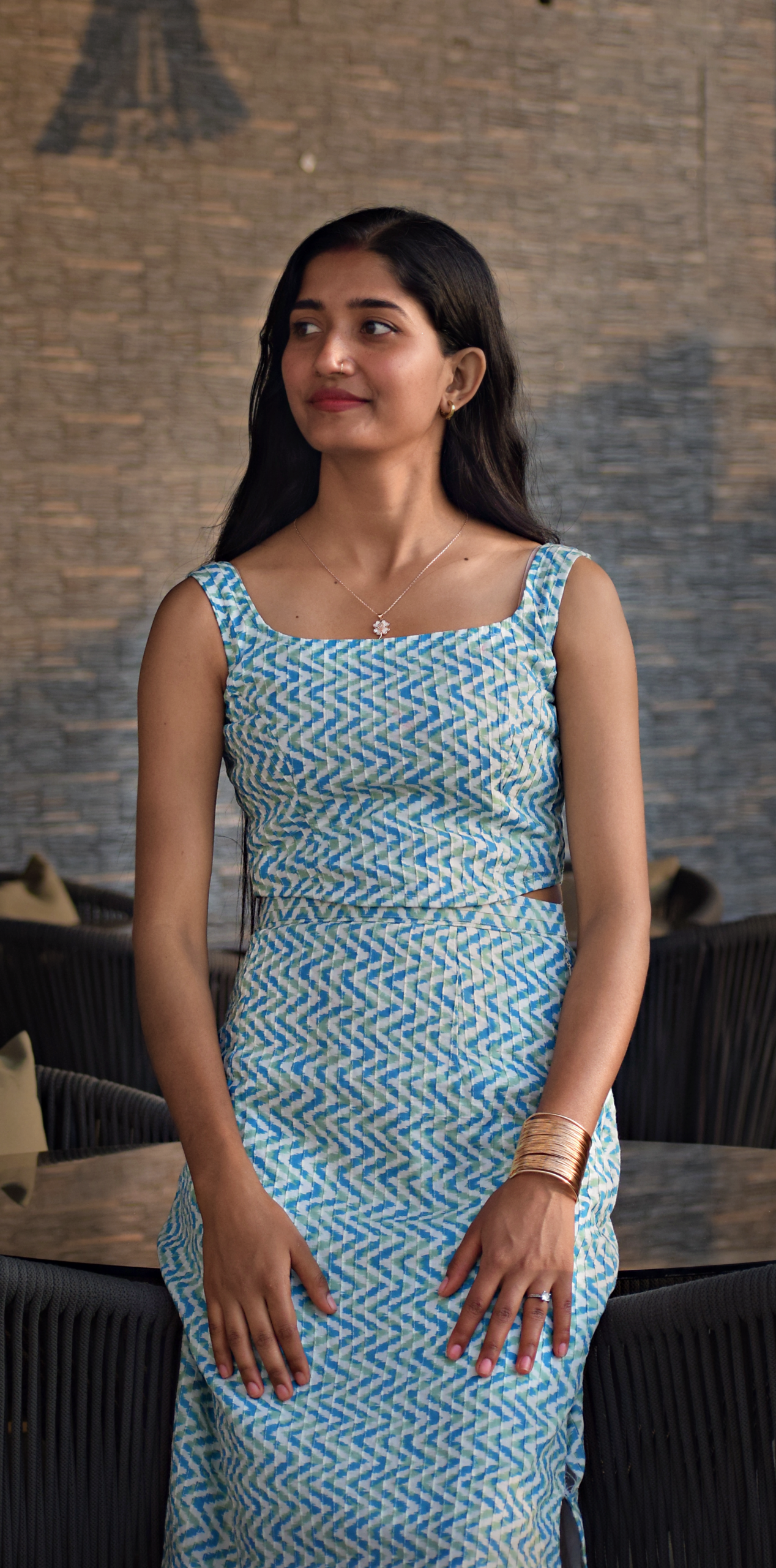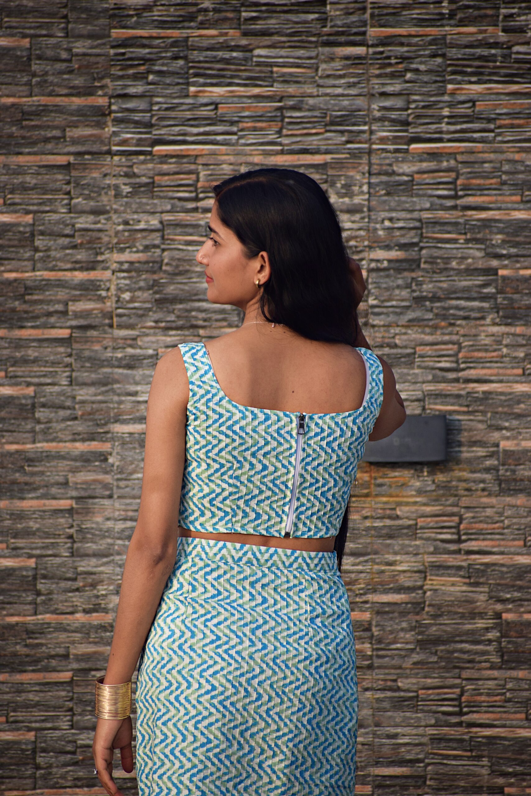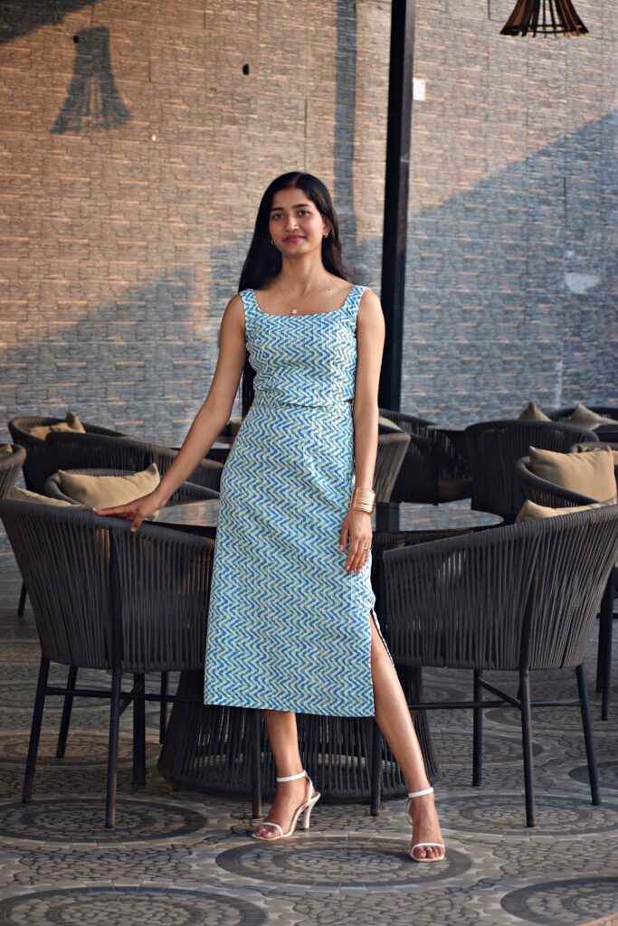 A sleeveless blue-and-white printed co-ord dress featuring a fitted crop top with a square neckline and a matching high-waist skirt.