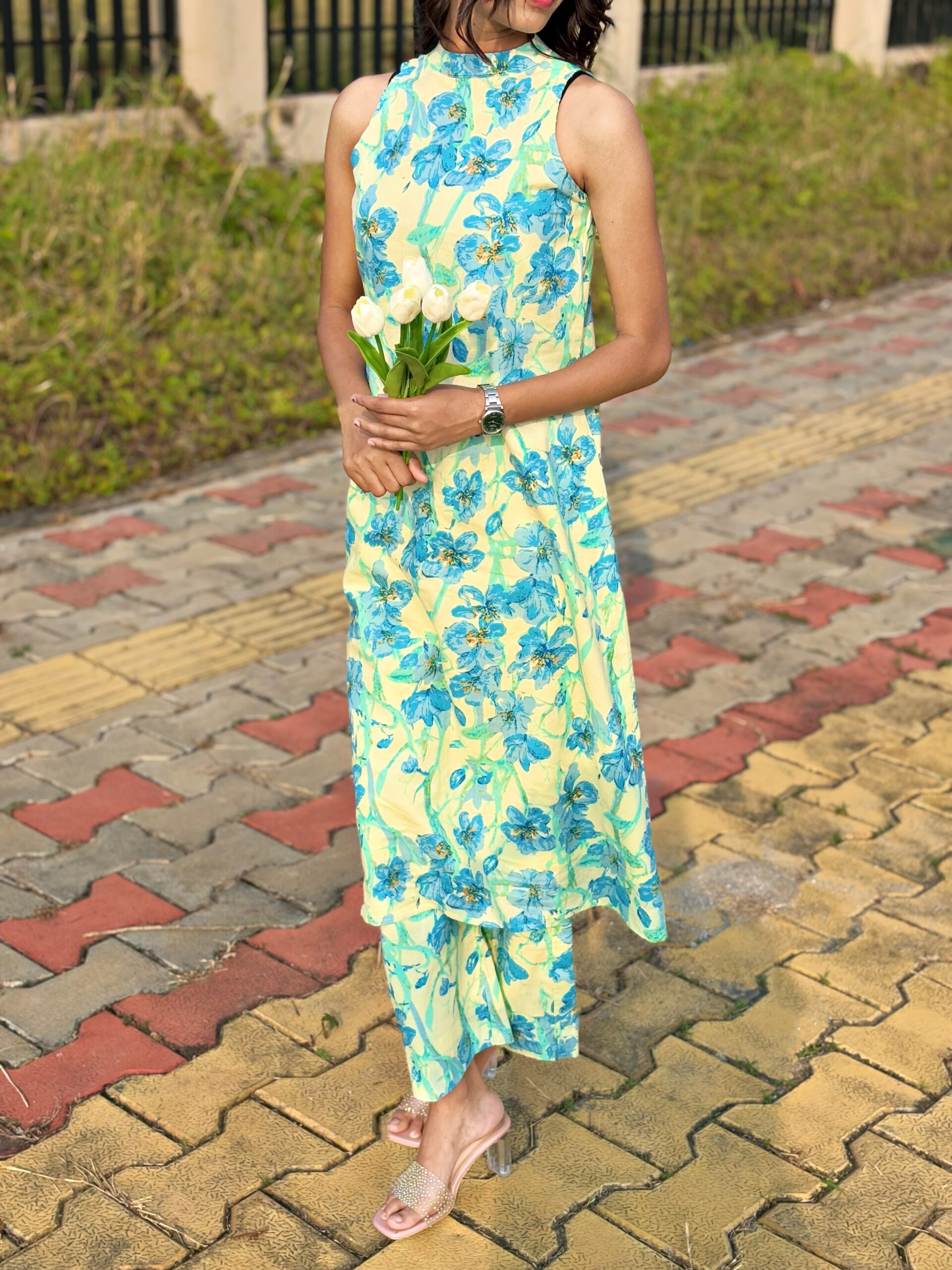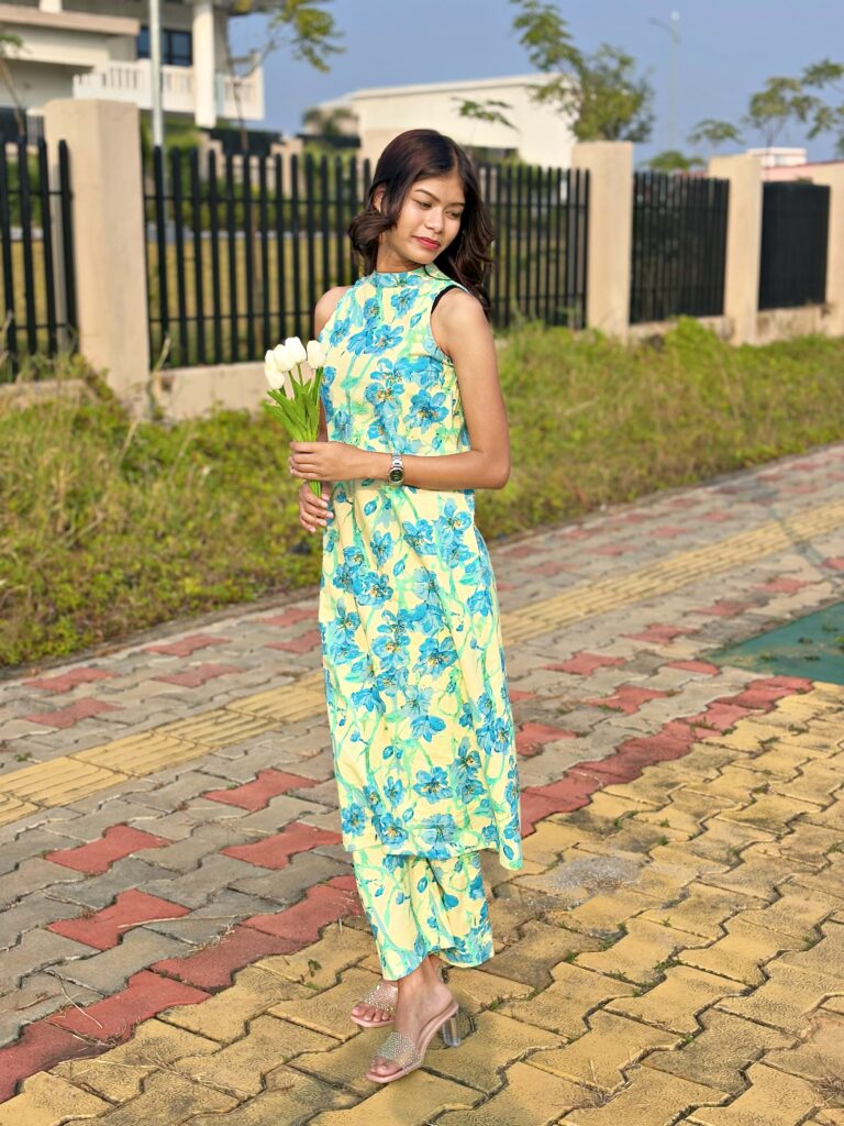 A sleeveless pastel yellow kurta set with blue floral prints, paired with matching straight-cut pants—light, elegant, and perfect for a fresh daytime look.