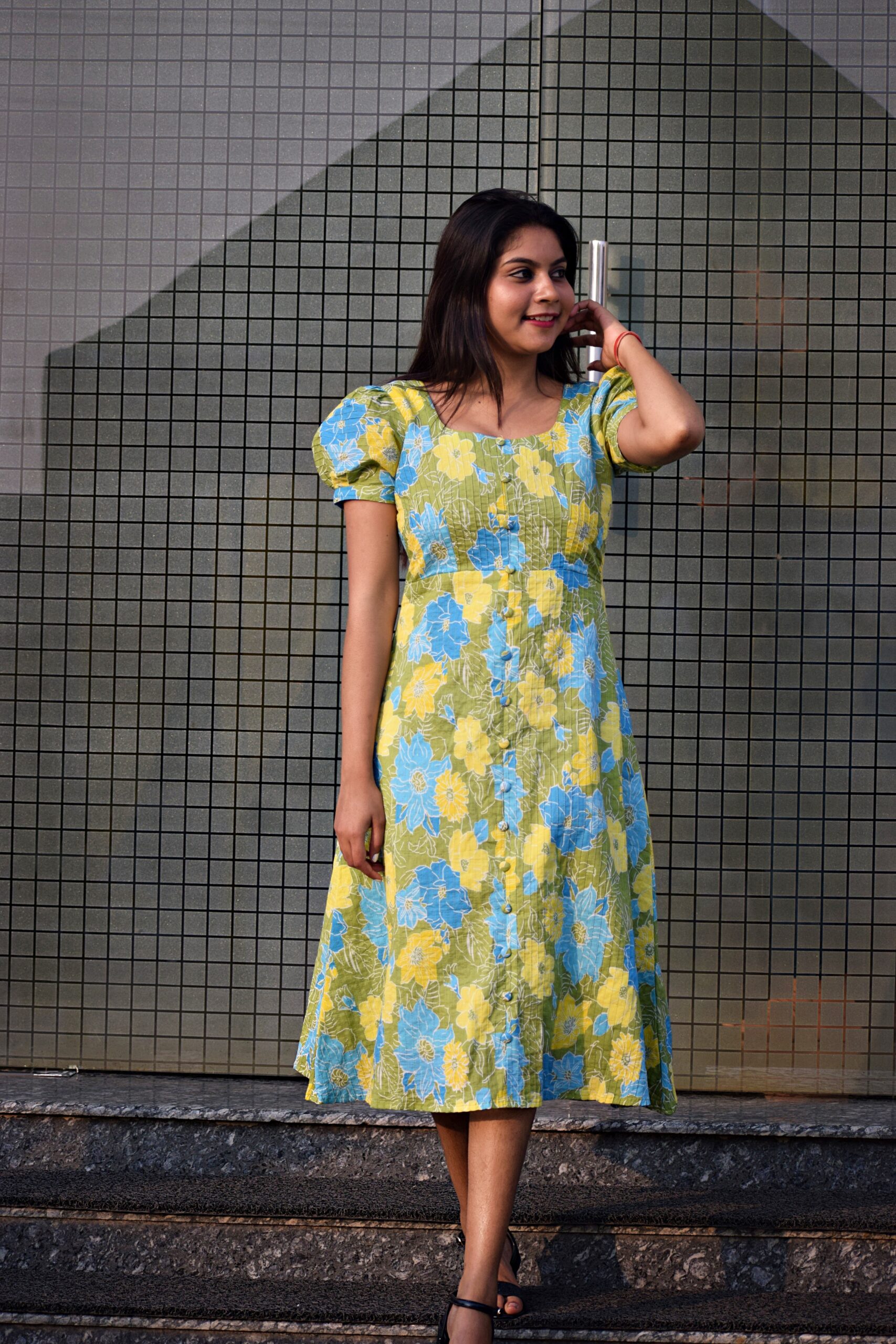 The dress is a knee-length, A-line dress with a fresh floral print in shades of green, yellow, and blue. It features short puff sleeves and a gently squared neckline that gives it a soft, feminine look. The front is detailed with a row of small buttons running down the center, adding a classic touch. Made from a lightweight fabric, the dress has a relaxed, flowy silhouette that feels comfortable and summery, perfect for casual outings or daytime wear.
