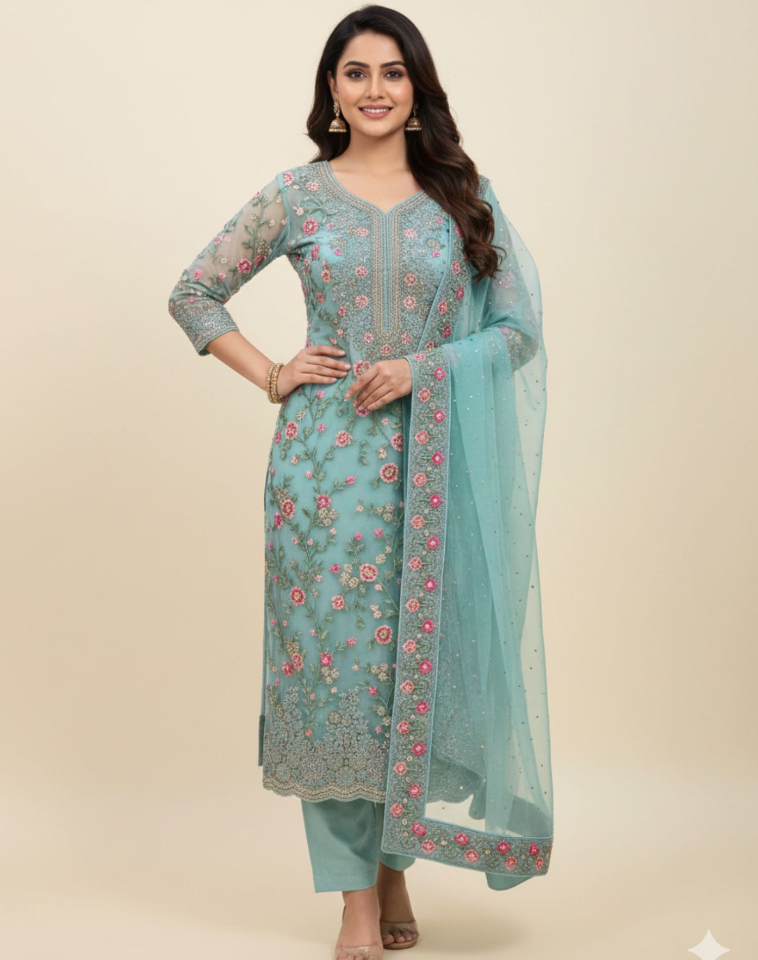 The Mughal Motif Silk Suit Set is a stunning ensemble inspired by ancient Mughal artistry. Crafted in rich silk fabric, it showcases finely embroidered floral and paisley motifs with zari and thread detailing.
